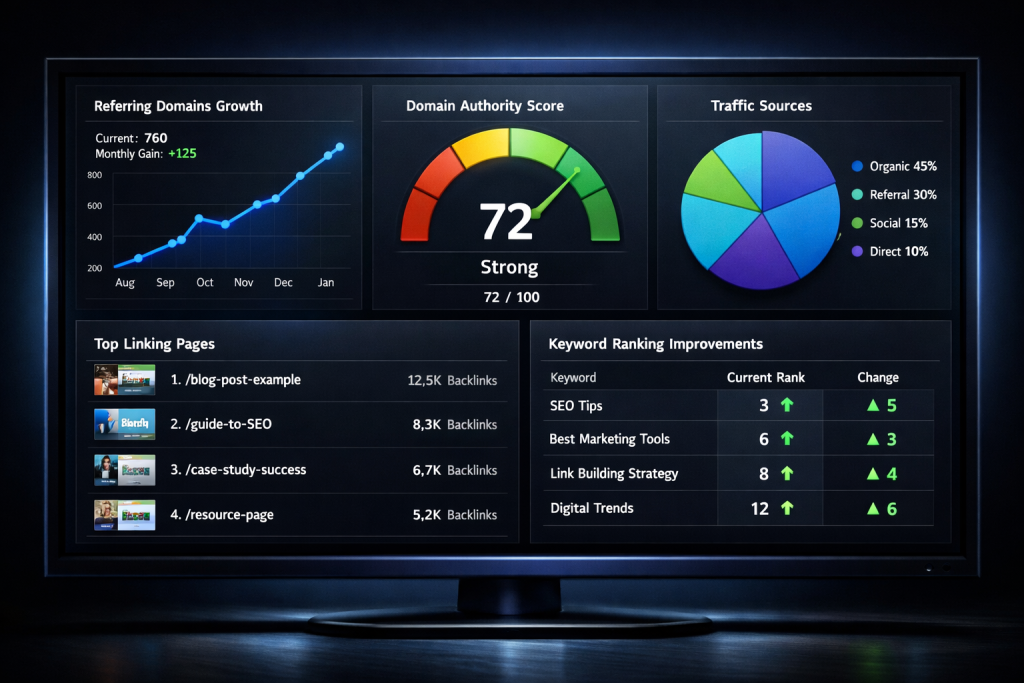 Monitor meaningful metrics that connect backlinks to business outcomes: organic rankings, traffic growth, referral conversions, and domain authority progression rather than just link counts.[1]